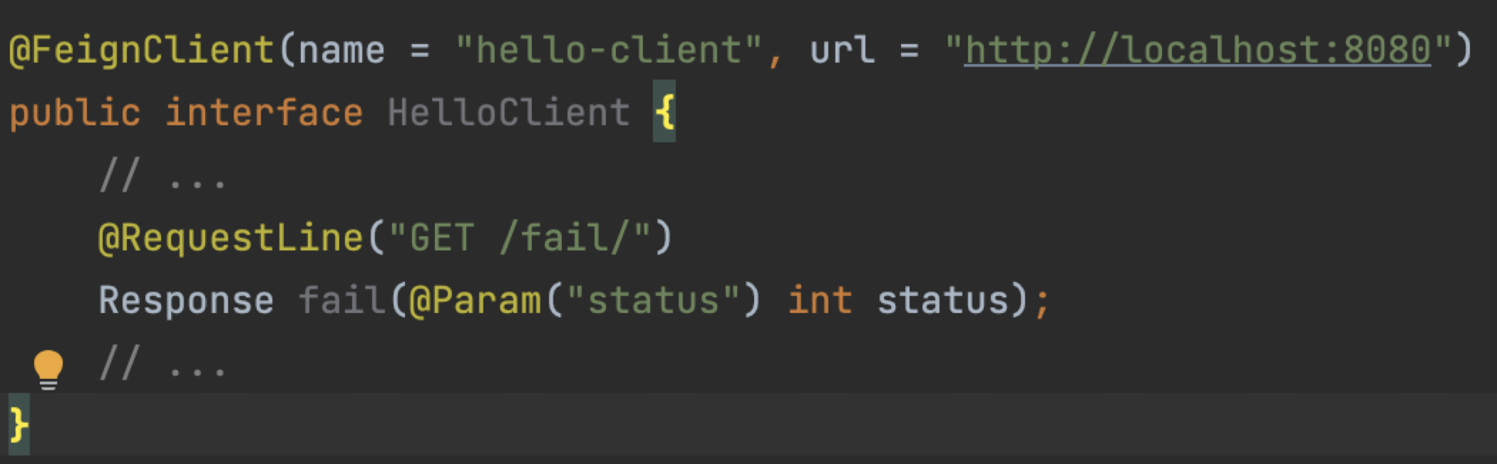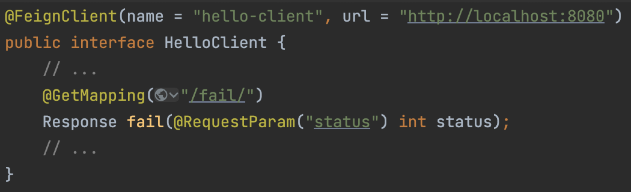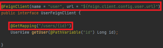 interface에 @FeignClient annotation을 붙여주신다음에, name을 지정해 주시고 (해당 name은 yaml에서 사용되며, 중복되어서는 안 됩니다), FeignClient에서 사용될 기본 url 즉 host를 넣어주시고, base config 이외에 추가로 설정이 필요하다면 config 파일을 정의 후에 configuration에 넣어주시면 됩니다.