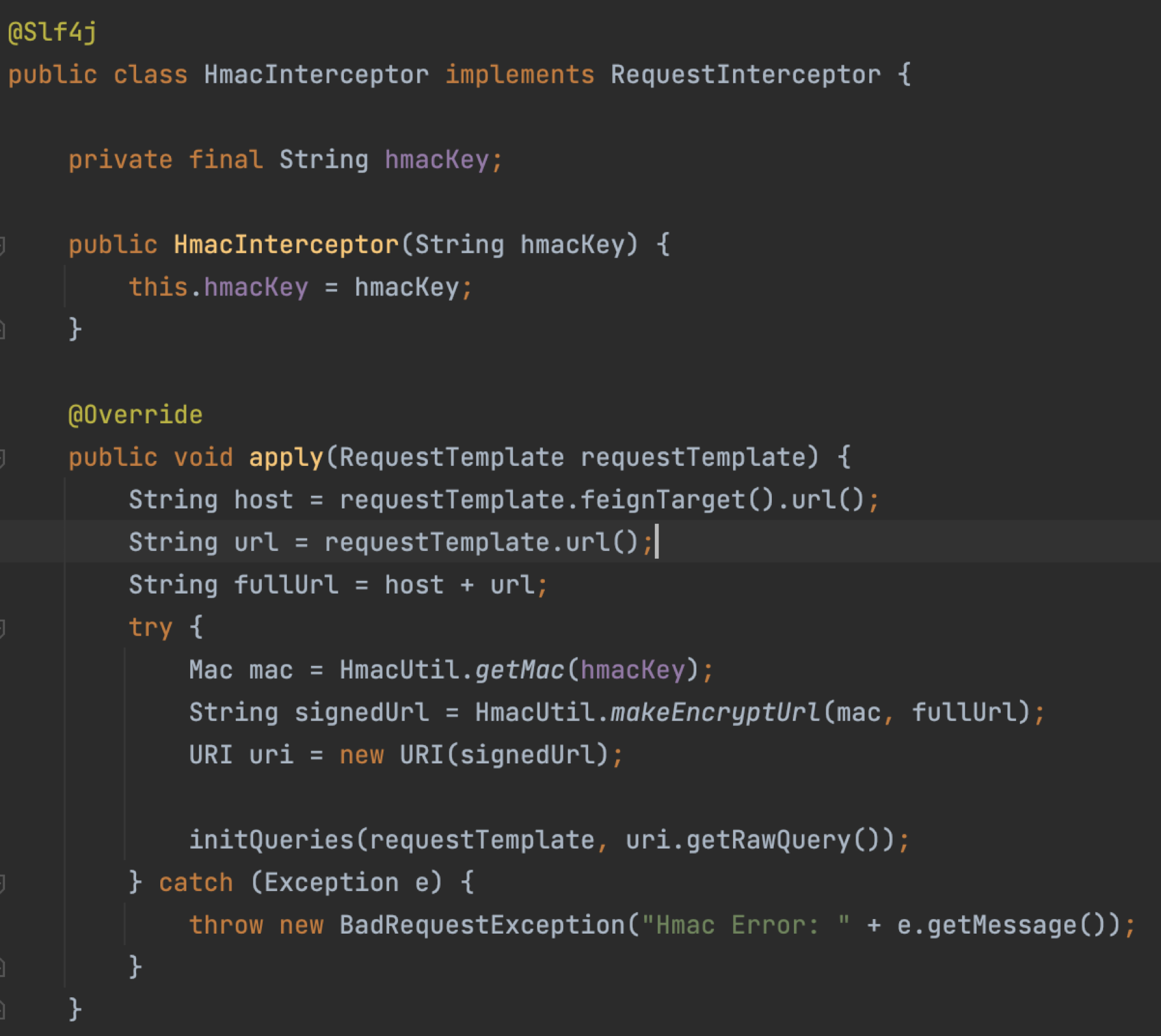 추가로 RequestInterceptor interface를 구현해서 직접 사용자 정의 Interceptor 들을 만들 수도 있습니다. apply라는 method를 구현해서 requestTemplate의 query, url 등을 변경할 수 있습니다. 주로 Hmac 기반 인증 방식을 구현할 때 유용하게 사용하였습니다.