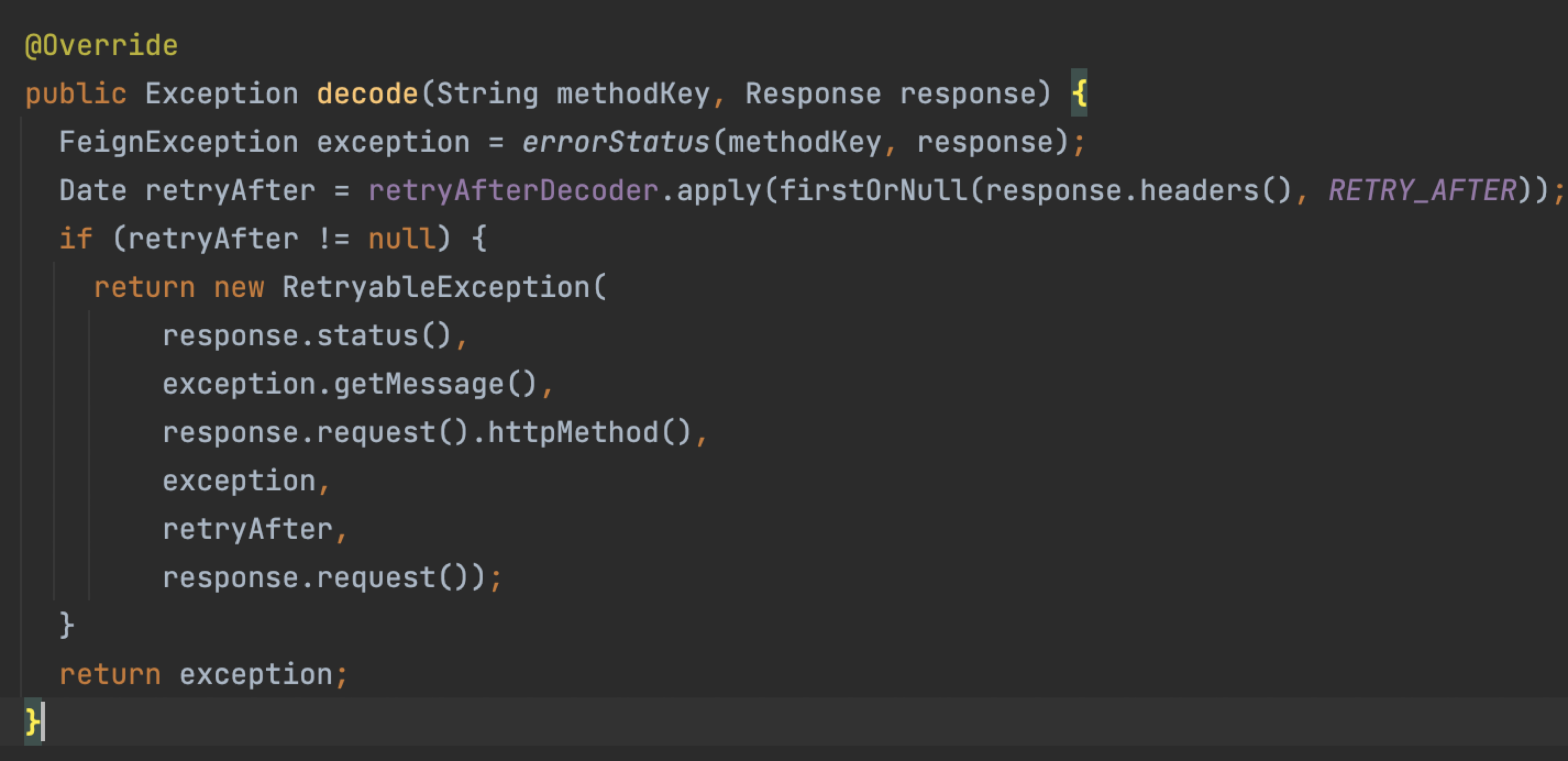 위 부분이 FeignClient에서 기본으로 제공하는 ErrorDecoder이고 해당 부분을 override 받아서 새로 정의해 줄 수도 있는데요. 똑같은 client안에서 method별로 status처리를 따로 처리하기 위해서는 methodKey, 즉 method이름을 가지고 handling 해야 되어서 조금은 적절하지 않은 방법이라 생각되었습니다.