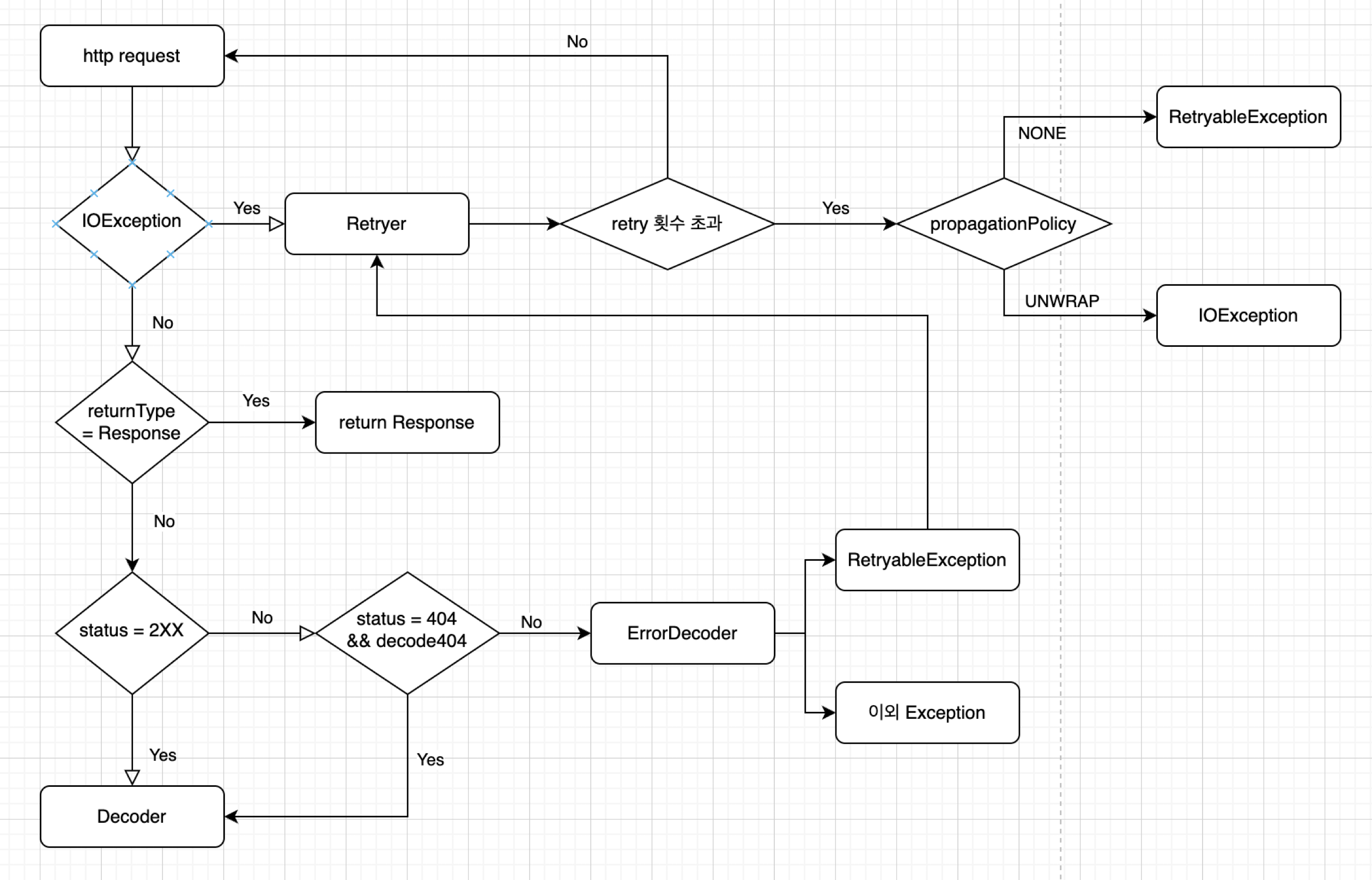 FeignClient의 Exception Handling 방식을 간단하게 살펴보면 httpRequest에 대해서 IOException이나 RetryableException이 반환된다면 Feign안에 정의된 Retryer를 이용해서 retry를 하게 되고, retry 횟수가 초과되면 propagationPolicy에 따라 exception이 wrapping 되어서 나가거나 Exception이 그대로 나가게 됩니다.